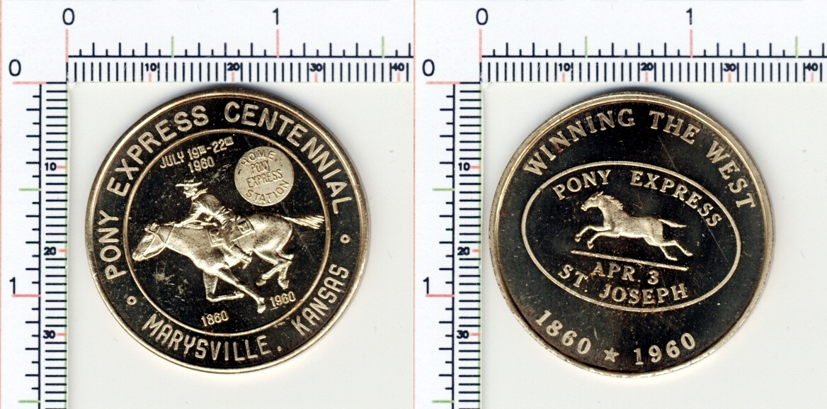 The obverse is similar, and shows Marysville, Kansas at the bottom and shows a round seal in the right field which says "HOME PONY EXPRESS STATION". A very nice muling. These have been slabbed by NGC as an HK-585a, but unlisted as a so-called dollar, as far as I know. These are not very common. Only 4 or 5 have been slabbed by NGC! Gilt Bronze w/couple of small spots.